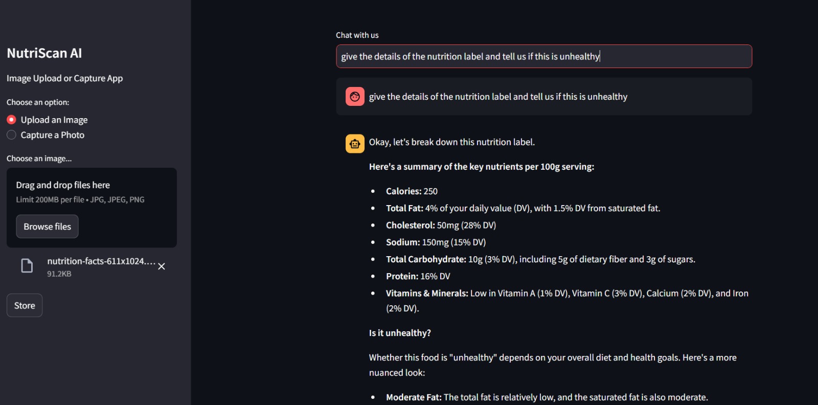Using Google Vision and Gemini API for the backend, and Streamlit.py for the frontend. NutriScan is very user-friendly. Take a picture of the nutrition label, NutriScan AI will scan it and then ask as many questions as you want. NutriScan AI will determine whether its healthy, halal, kosher, diet-friendly or not.